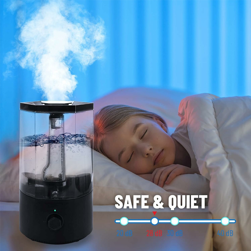 The humidifier features a display-off sleep mode and exclusive silent spray technology, ensuring the noise is less than 23dB. Even the most sensitive babies can sleep deeply and soundly all night. The top-fill design combines a removable water tank and a 5.3-inch wide opening to avoid getting your table wet, making filling and cleaning a breeze.